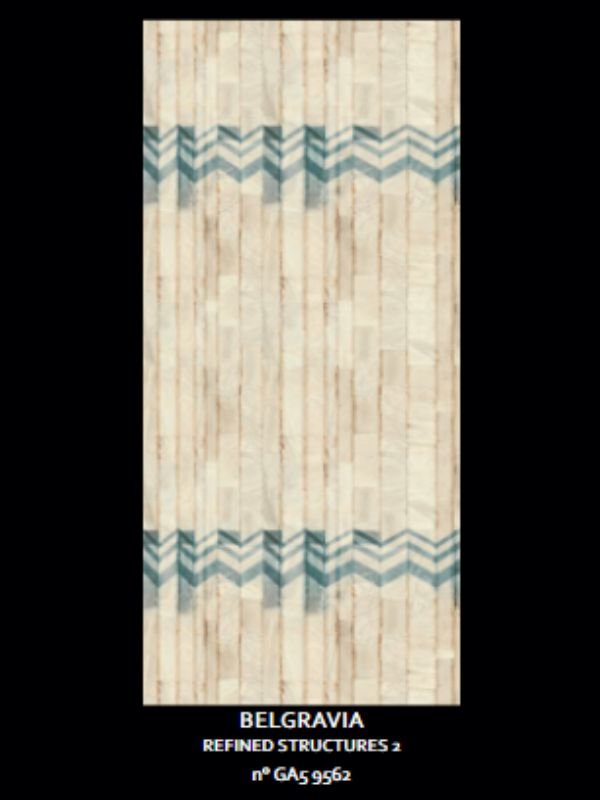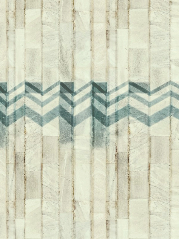 The borough of Belgravia, in London, is famous for the white palaces in neoclassical style that express a mood of rigorous elegance. The seeming simplicity of the architecture, which appears at first glance, is actually a dynamic series of marbles and stuccos, statues and decorative motifs. This new wallcovering follows this concept of “unexpected detail”: the background, based on a play of large tiles of streaked marble, is crossed horizontally at the top and at the bottom by a contrasting frame with chevron motif. Once more, the wallcovering becomes the occasion to tran-sform key elements of the Armani style like stones and the textile design. The range is coordinated with a printed version with marble tiles only.