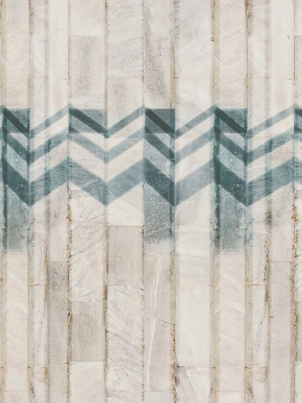 ARMANI / CASA Refined Structure 2 luxury wallcovering featuring layered stone textures and soft geometric chevron accents in warm ivory and champagne tones for elegant premium interiors.