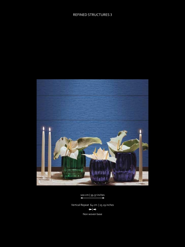 - La collezione Refined Structures 3 trae ispirazione dal vasto universo di stilemi Armani/Casa. I supporto vinilico – leit motiv della collezione, così come per le precedenti Refined Structures – è impiegato sapientemente per ricreare, grazie a tecniche produttive appositamente studiate, texture tridimensionali ed effetti materici che spaziano dalla moda alla natura.Le tipiche irregolarità dello shantung di seta e il caratteristico disegno delle finiture moire si rifanno al mondo dei filati e dei tessuti preziosi, elementi vegetali, quali il bambi e le foglie di ginkgo, omaggiano ifascino dell’estremo Oriente; trompe-l’oeil ed effetti boisere richiamano l’estetica dei rivestimenti murali d’altri tempi, reinterpretata in chiave contemporanea; disegni a intreccio celebrano l’artigianalitoe le lavorazioni manuali della tradizione.Novità introdotta dalla collezione Refined Structures è il formato, che per la prima volta propone roll dalla larghezza fissa a 1 metro.The Refined Structures 3 collection takes inspiration from the vast universe of Armani/Casa design. The vinyl support – leit motif of the collection as per the previous Refined Structures collections – is used strategically to recreate a three-dimensional texture and rich material effects, thanks to specifically conceived production techniques, ranging from fashion to nature.Typical irregularities of shantung silk and the defining pattern of moiré finishes recall the world of precious yarns and fabrics; plant elements, such as bamboo and gingko leaves, are a tribute to the charm of the Far East; trompe-l’oeil and boiserie effects remind the aesthetic of antique walloverings, reinterpreted in a contemporary way; intertwined motifs celebrate craftsmanshipand traditional handwork.A novelty introduced by the Refined Structures 3 collection is the format, which offers for the first time a standard width of 1 meter.