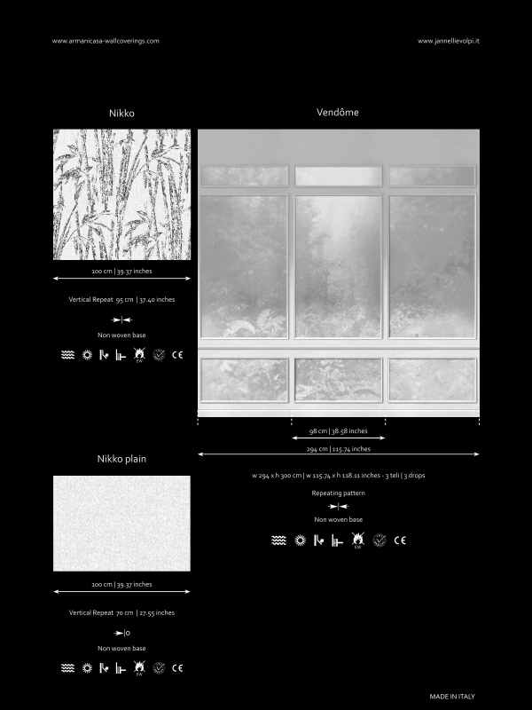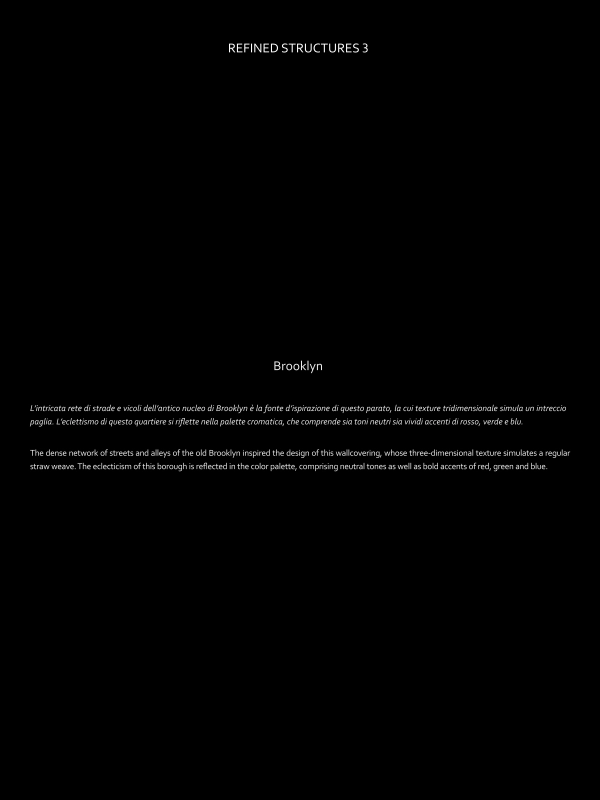 - La collezione Refined Structures 3 trae ispirazione dal vasto universo di stilemi Armani/Casa. I supporto vinilico – leit motiv della collezione, così come per le precedenti Refined Structures – è impiegato sapientemente per ricreare, grazie a tecniche produttive appositamente studiate, texture tridimensionali ed effetti materici che spaziano dalla moda alla natura.Le tipiche irregolarità dello shantung di seta e il caratteristico disegno delle finiture moire si rifanno al mondo dei filati e dei tessuti preziosi, elementi vegetali, quali il bambi e le foglie di ginkgo, omaggiano ifascino dell’estremo Oriente; trompe-l’oeil ed effetti boisere richiamano l’estetica dei rivestimenti murali d’altri tempi, reinterpretata in chiave contemporanea; disegni a intreccio celebrano l’artigianalitoe le lavorazioni manuali della tradizione.Novità introdotta dalla collezione Refined Structures è il formato, che per la prima volta propone roll dalla larghezza fissa a 1 metro.The Refined Structures 3 collection takes inspiration from the vast universe of Armani/Casa design. The vinyl support – leit motif of the collection as per the previous Refined Structures collections – is used strategically to recreate a three-dimensional texture and rich material effects, thanks to specifically conceived production techniques, ranging from fashion to nature.Typical irregularities of shantung silk and the defining pattern of moiré finishes recall the world of precious yarns and fabrics; plant elements, such as bamboo and gingko leaves, are a tribute to the charm of the Far East; trompe-l’oeil and boiserie effects remind the aesthetic of antique walloverings, reinterpreted in a contemporary way; intertwined motifs celebrate craftsmanshipand traditional handwork.A novelty introduced by the Refined Structures 3 collection is the format, which offers for the first time a standard width of 1 meter.