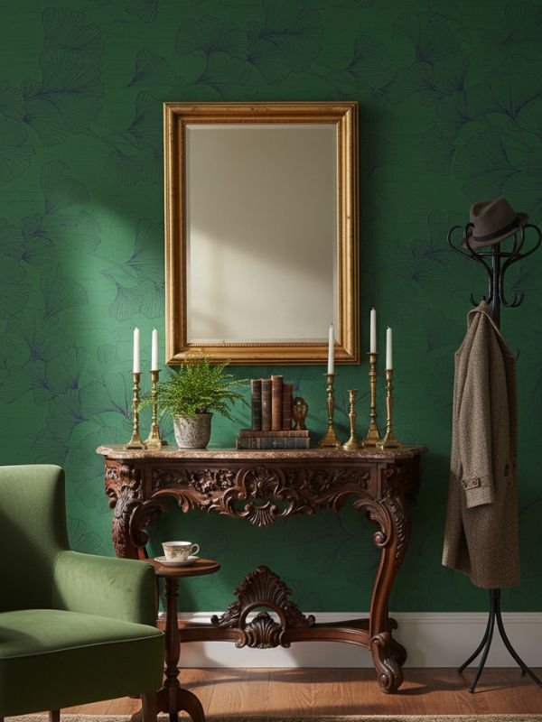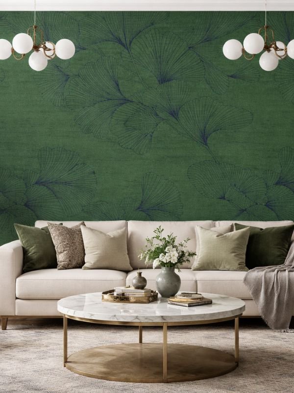 Soft sage green ginkgo leaf wallpaper with textured background, modern botanical wall covering for living room and bedroom interiors