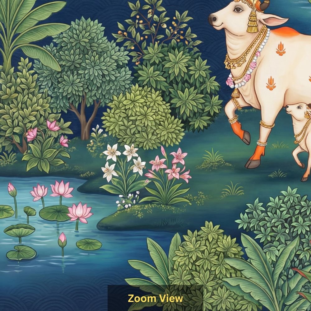 | Pattern Name : | Sacred Cow and Calf Indian Miniature Style Wallpaper with Lotus Pond and Nature Motifs |