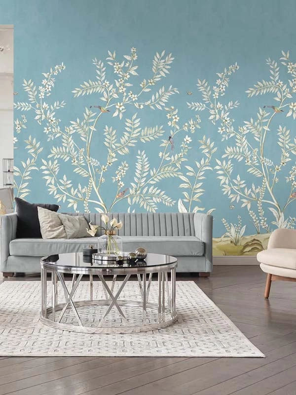 Soft blush pink floral mural wallpaper with delicate white botanical branches and birds, styled in a modern luxury living room with a grey sofa and glass coffee table