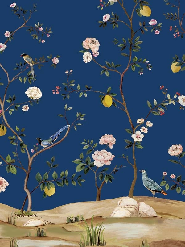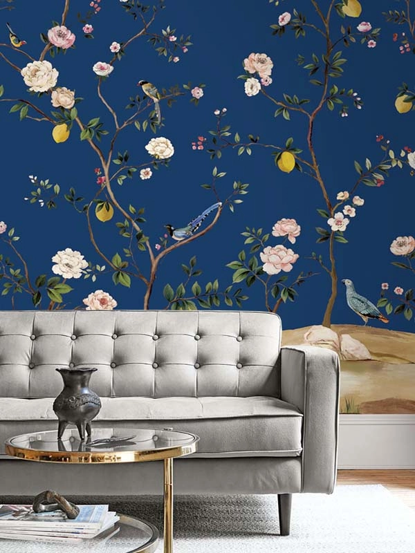 Elegant floral bird mural wallpaper with pastel blue background, featuring blooming branches, lemons, and colorful birds in a classic vintage style living room setting.
