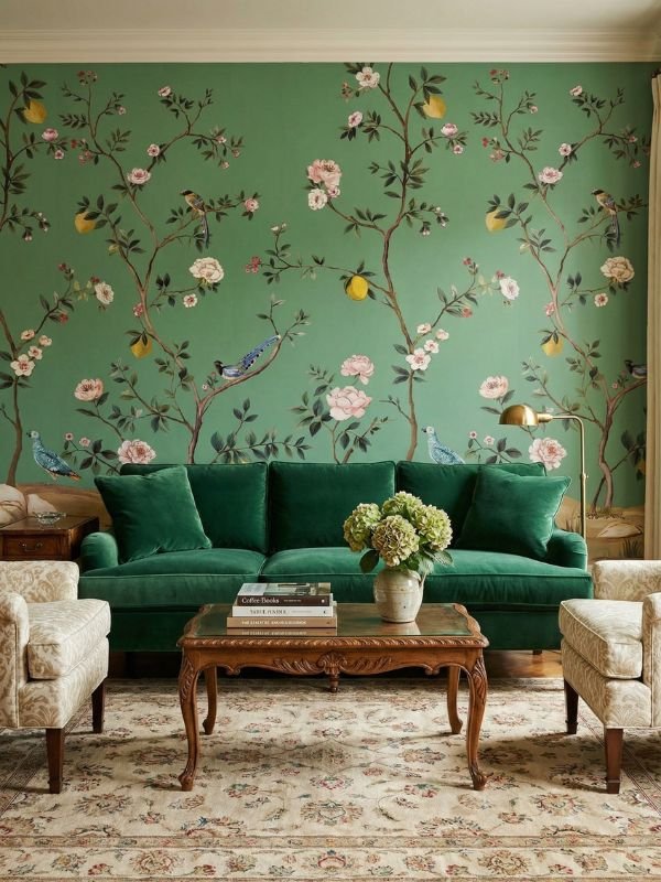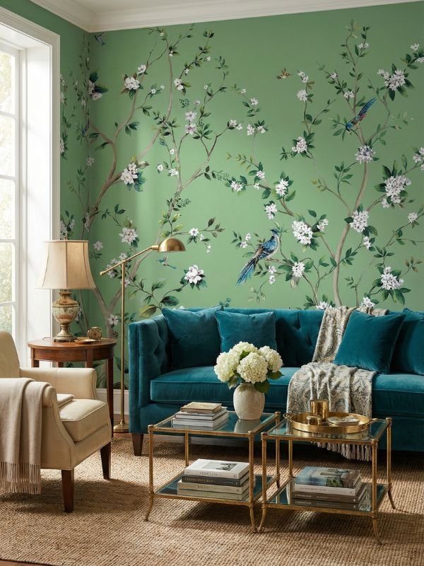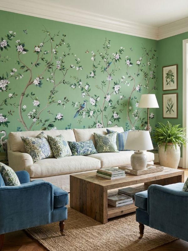 - Living Room Feature Wall (ideal with jewel-toned furniture like teal or emerald sofas)