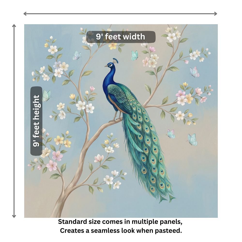 Pattern Name : Elegant Peacock Wall Mural with Pastel Blossoms & Butterflies