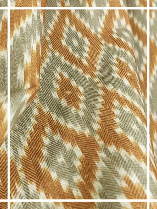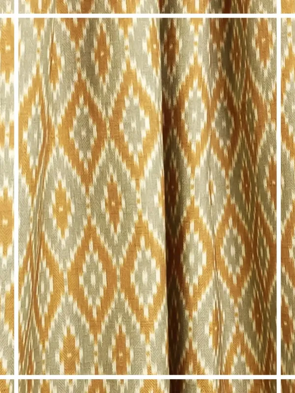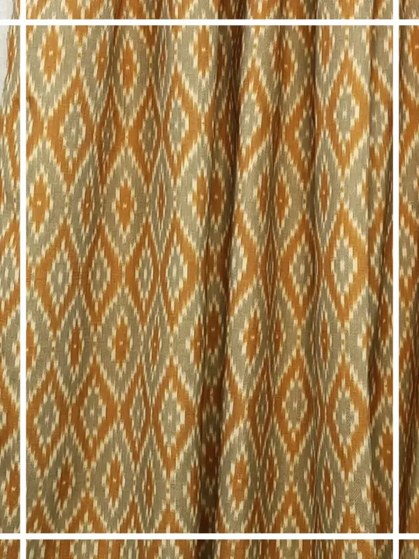 Olive green ikat pattern curtain fabric with subtle ethnic motifs on a neutral base, designer curtains for modern Indian interiors.