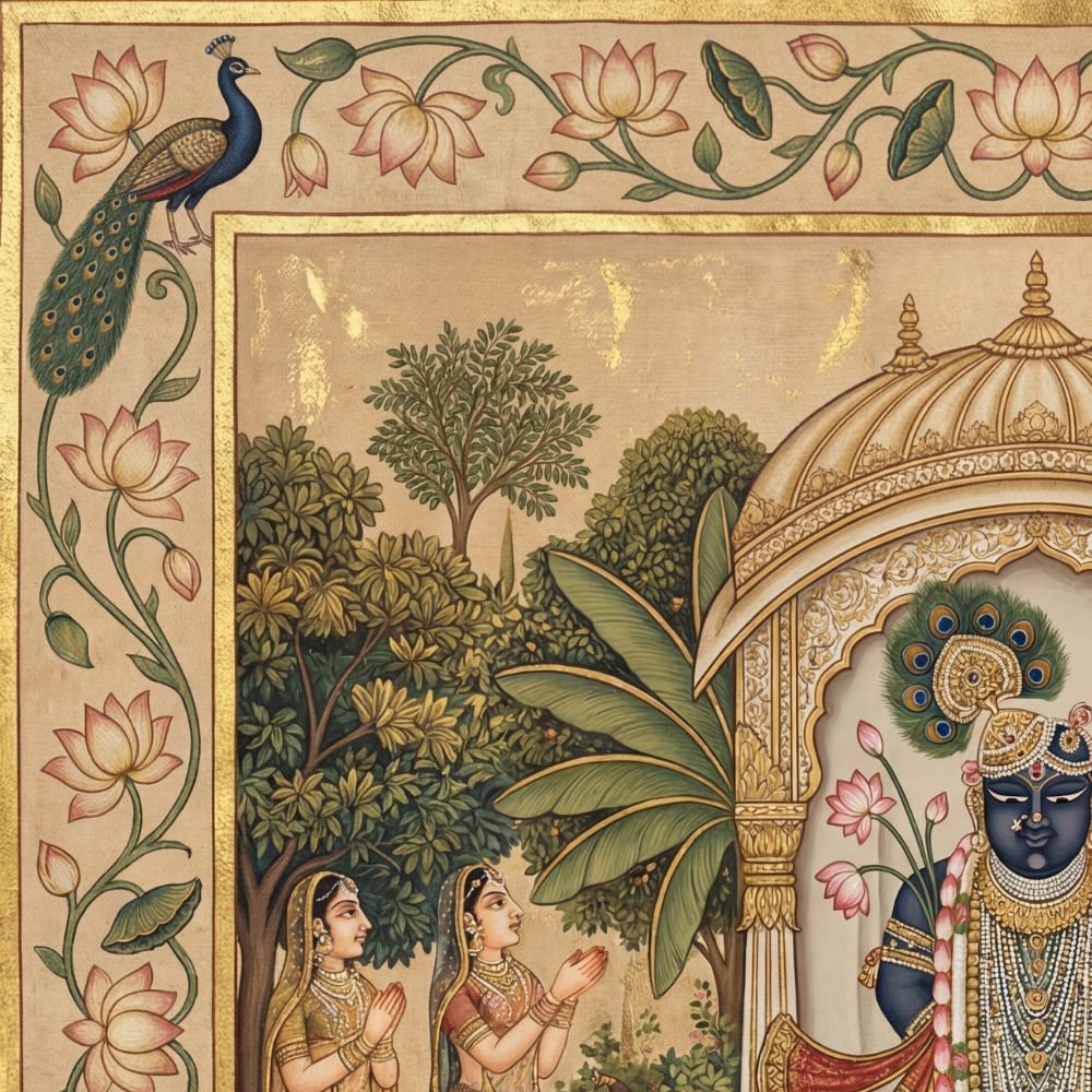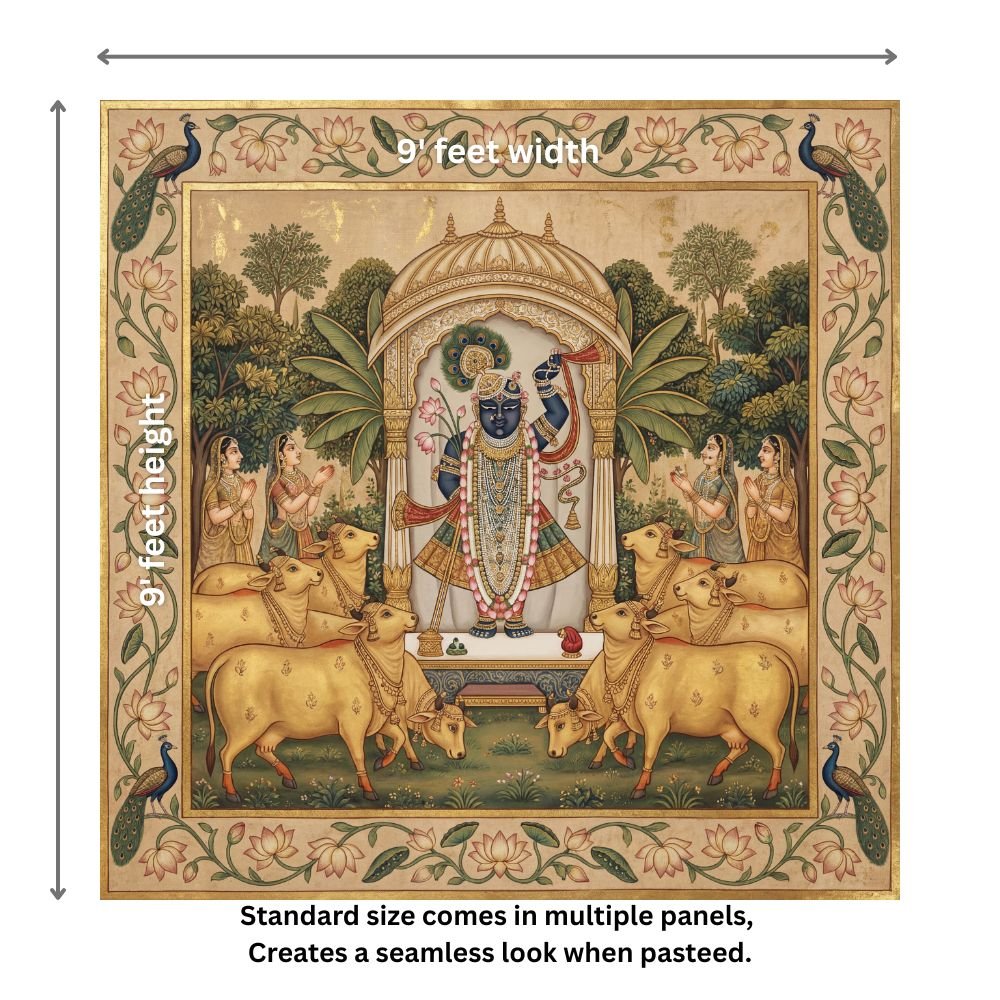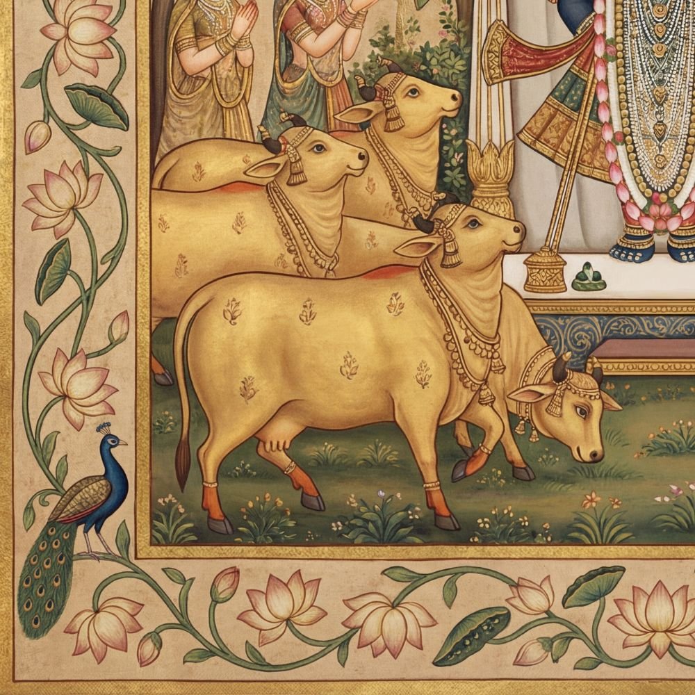 | Pattern Name : | Traditional Pichwai Shrinathji Painting – Golden Cows, Gopis & Lotus Floral Border Wall Art |