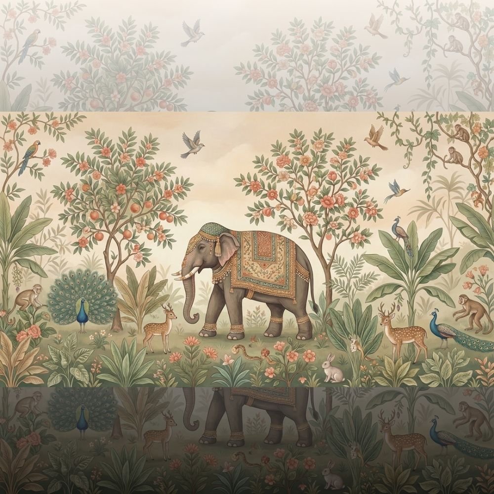 Indian miniature jungle wallpaper mural featuring a regal elephant with traditional textile, peacocks, deer, birds, and flowering trees in soft pastel tones for luxury interiors