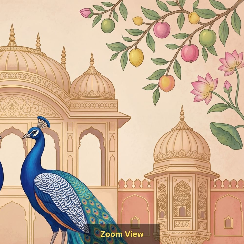 Pattern Name : Royal Peacock Pair Mughal Palace Style Wallpaper with Lotus Motifs